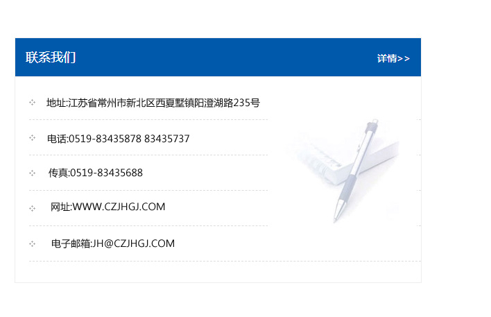 地址:常州市新北區友邦商務大廈1幢16、17層  電話:0519-85101652  傳真:0519-85112595  郵編:213022  網址:www.cz-jiayue_cn.lcjingde.com  郵箱:xiajifengaa@163.com